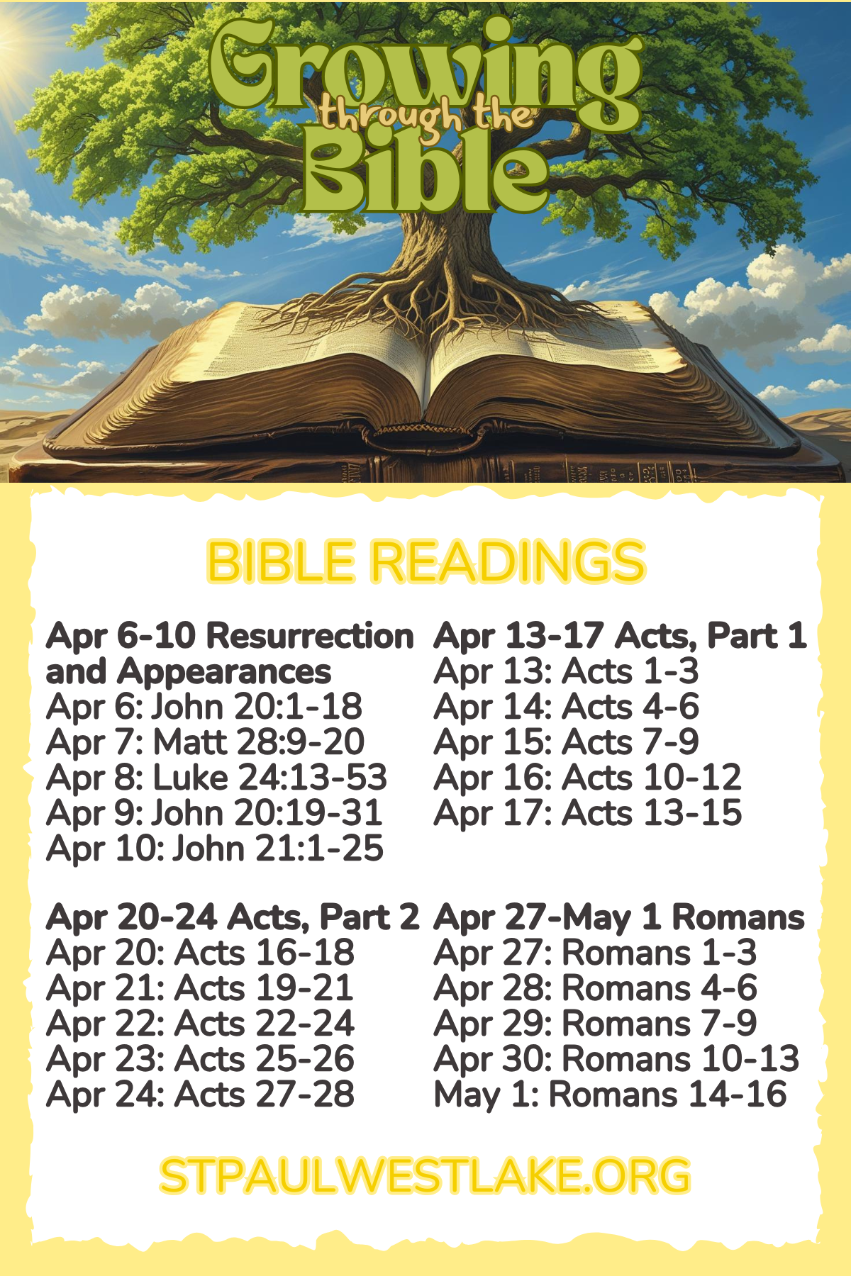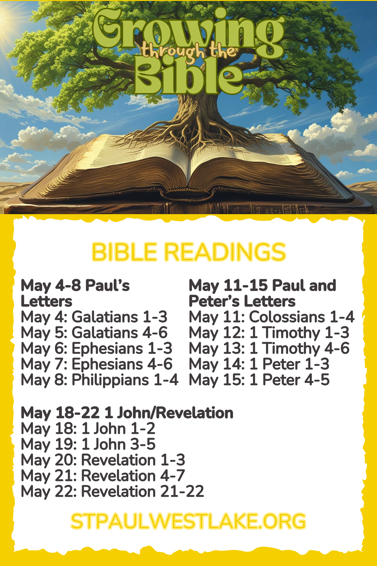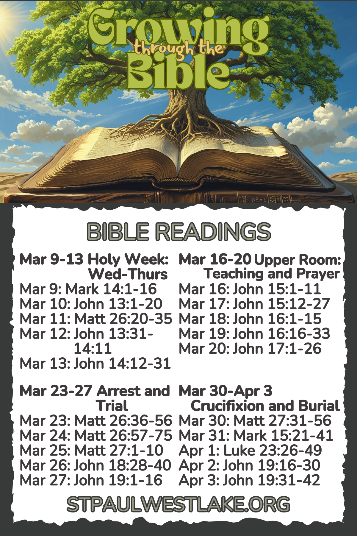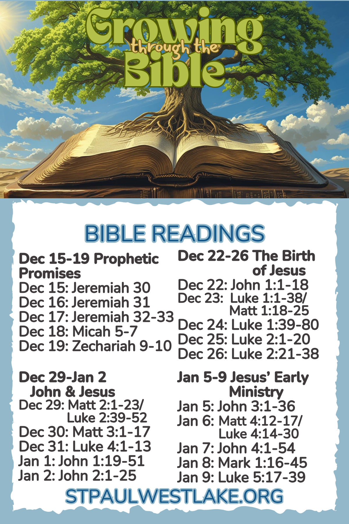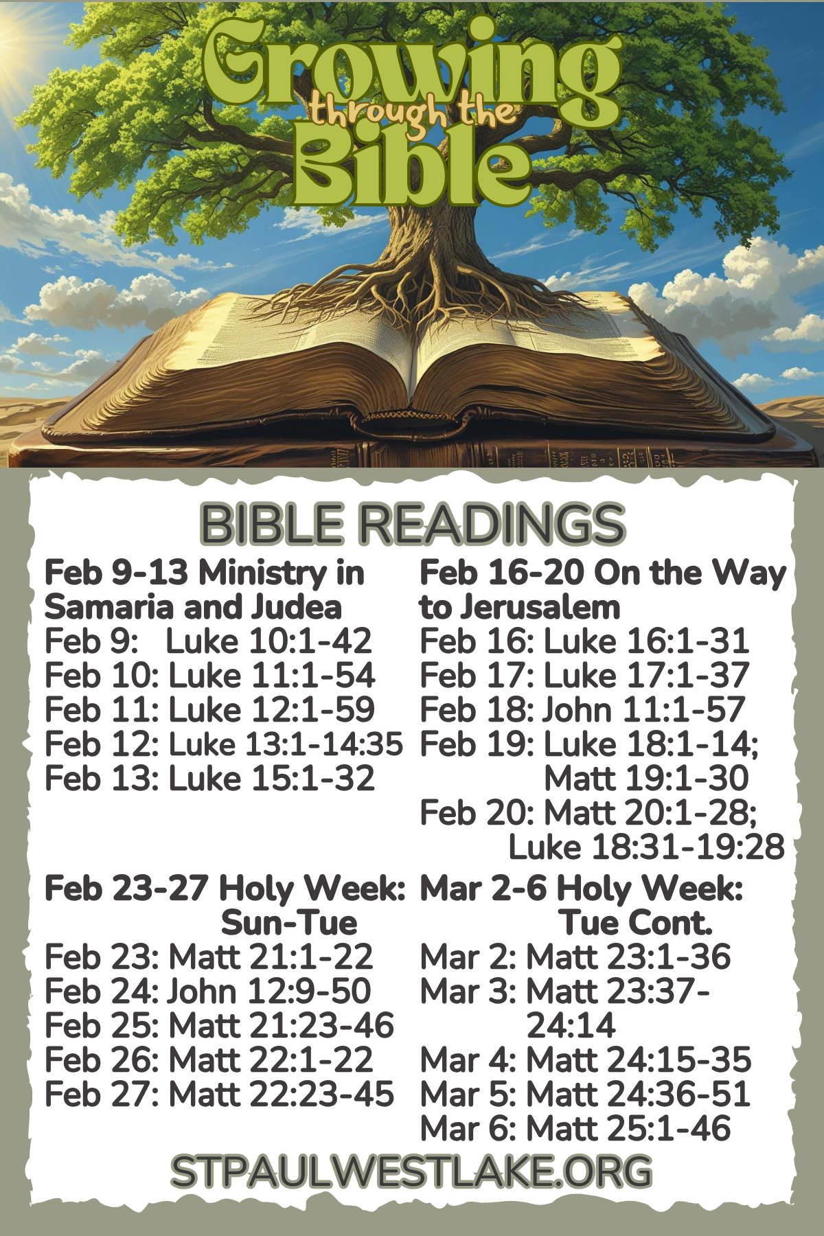 Join us! We are Growing Through The Bible - a year-long journey through the Bible. Here are images of THIRD bookmarker (two sided) with our daily readings for Mondays-Fridays. (Contact the office if you need the other ones.) Each Sunday sermon will be based on scripture for the coming week. Read, learn, and grow closer to God!