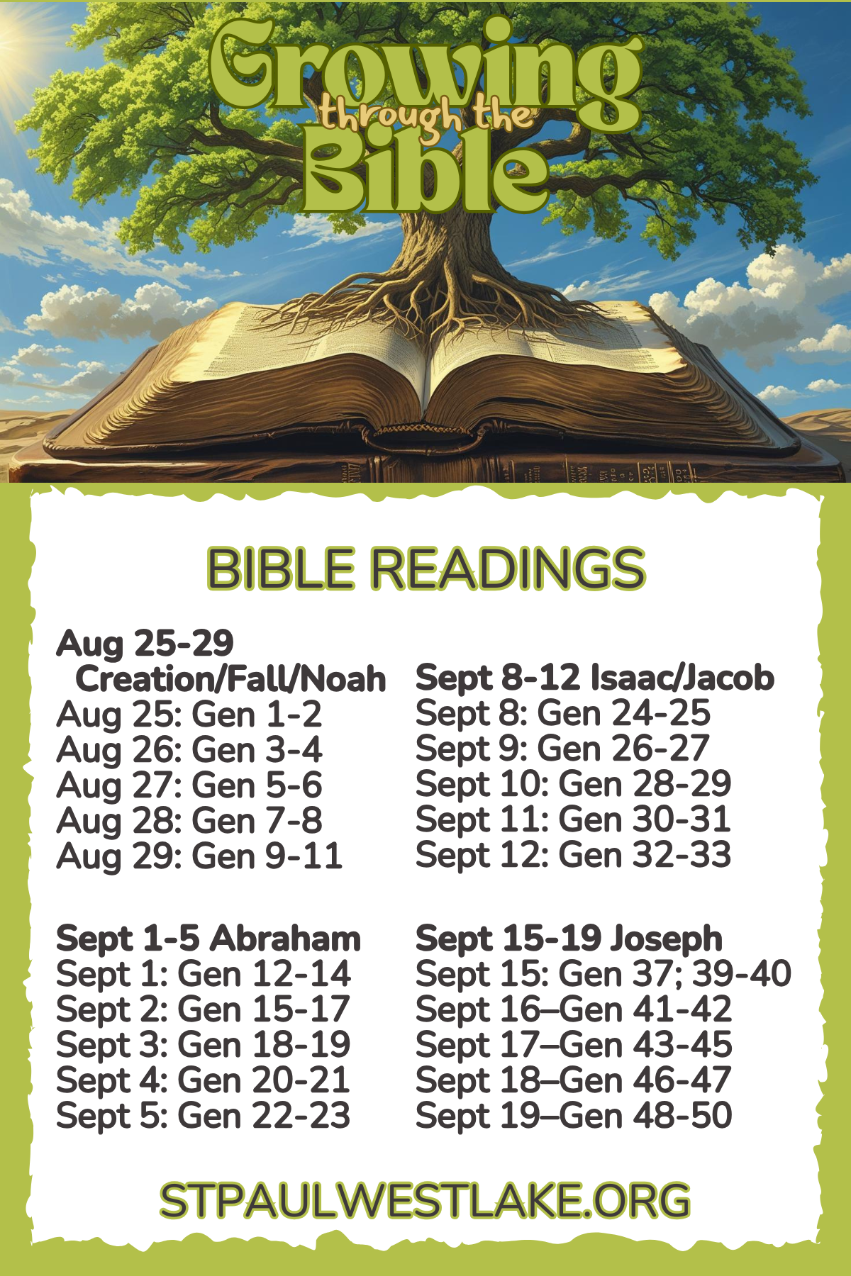 Join us! We are Growing Through The Bible - a year-long journey through the Bible starting August 25th. Here are images of the first bookmark (two sided) with our daily readings for Mondays-Fridays. Each Sunday sermon will be based on scripture for the coming week. Read, learn, and grow closer to God!